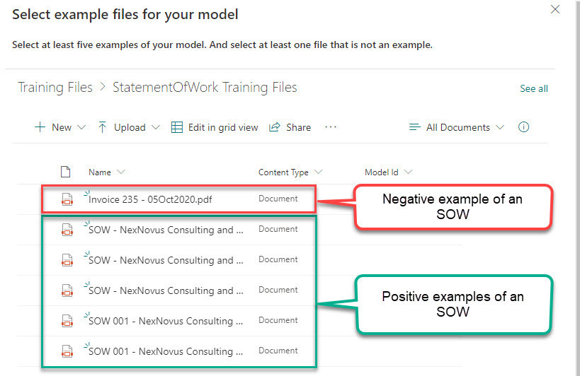 In the Training Files library, I created a folder to house the example files specific for the StatementOfWork DU Model. I then uploaded 5 positive examples and 1 negative example into the folder, selected them, and added them to my model: