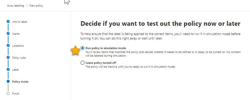 Once the simulation is done and you have verified the conditions are configured correctly, you can enable the service-side auto-labeling policy to automatically apply the Sensitivity label to content matching the condition(s) specified.