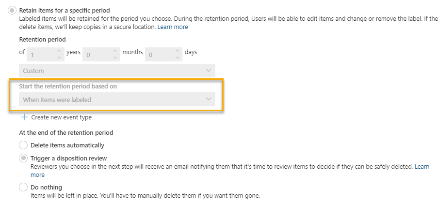 Create a retention label with your retention requirements. In this post, a retention label, Test Review Label, is created to retain for 1 year (2 days for my test) from date labeled then trigger a disposition review. (optional). By starting the retention period based on when the items are labeled, this provides you the control to start the retention clock.