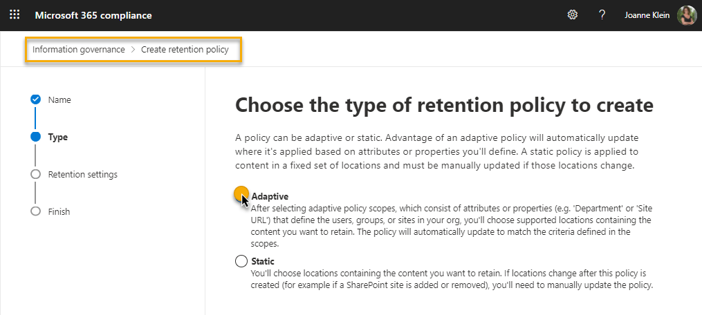 I’ll create a new retention policy with a type of Adaptive: