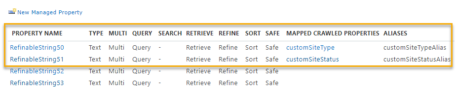 Browsing to the tenant-level search schema, I see 2 crawled properties have been automatically generated that map directly to the 2 custom property bag properties: customSiteType and customSiteStatus.