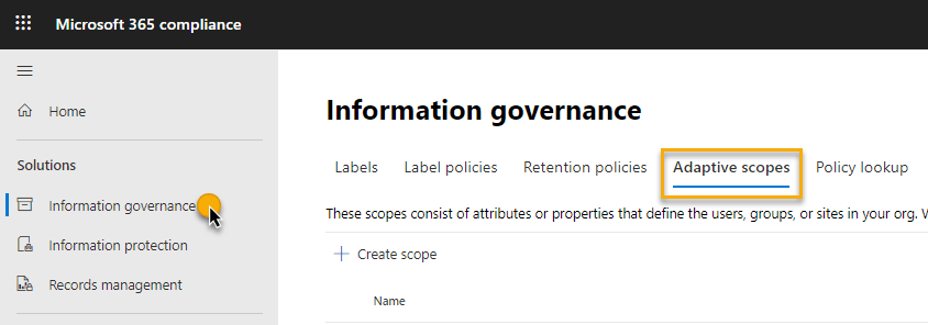 You’ll see the Adaptive scopes tab in 2 places in the Compliance Center: within Information governance and within Records management. This is because you can define an adaptive scope for either a retention policy or a retention label policy. In our example, we’re applying a retention policy so I’ll go to Information governance… Adaptive scopes: