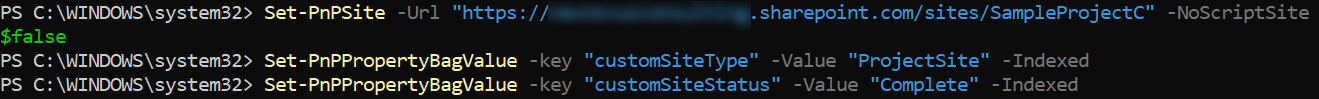 I used PnP PowerShell in my provisioning solution to connect to the Project site and set 2 properties: (in addition to enabling scripts prior to setting the property bag values, you should also disable scripts when you’re done!)