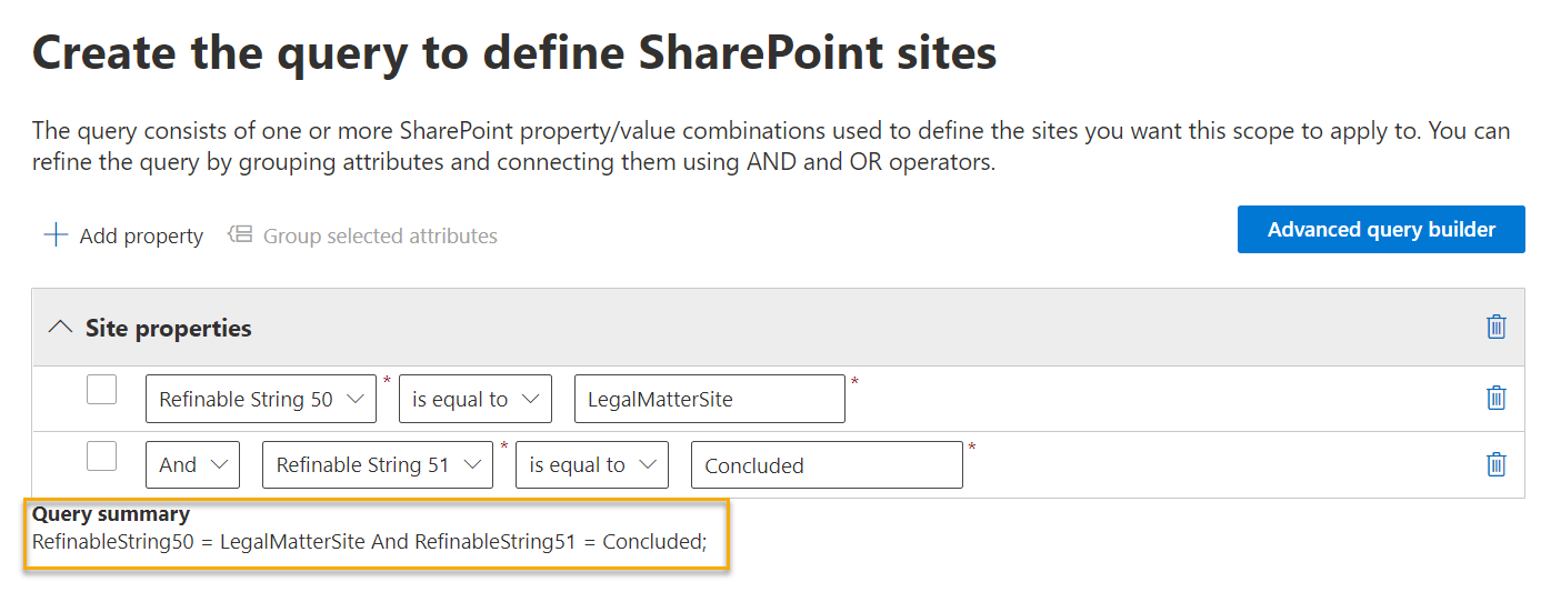I’ll add my 2 RefinableString managed property conditions so I’m only including Concluded Legal Matter sites in this scope: