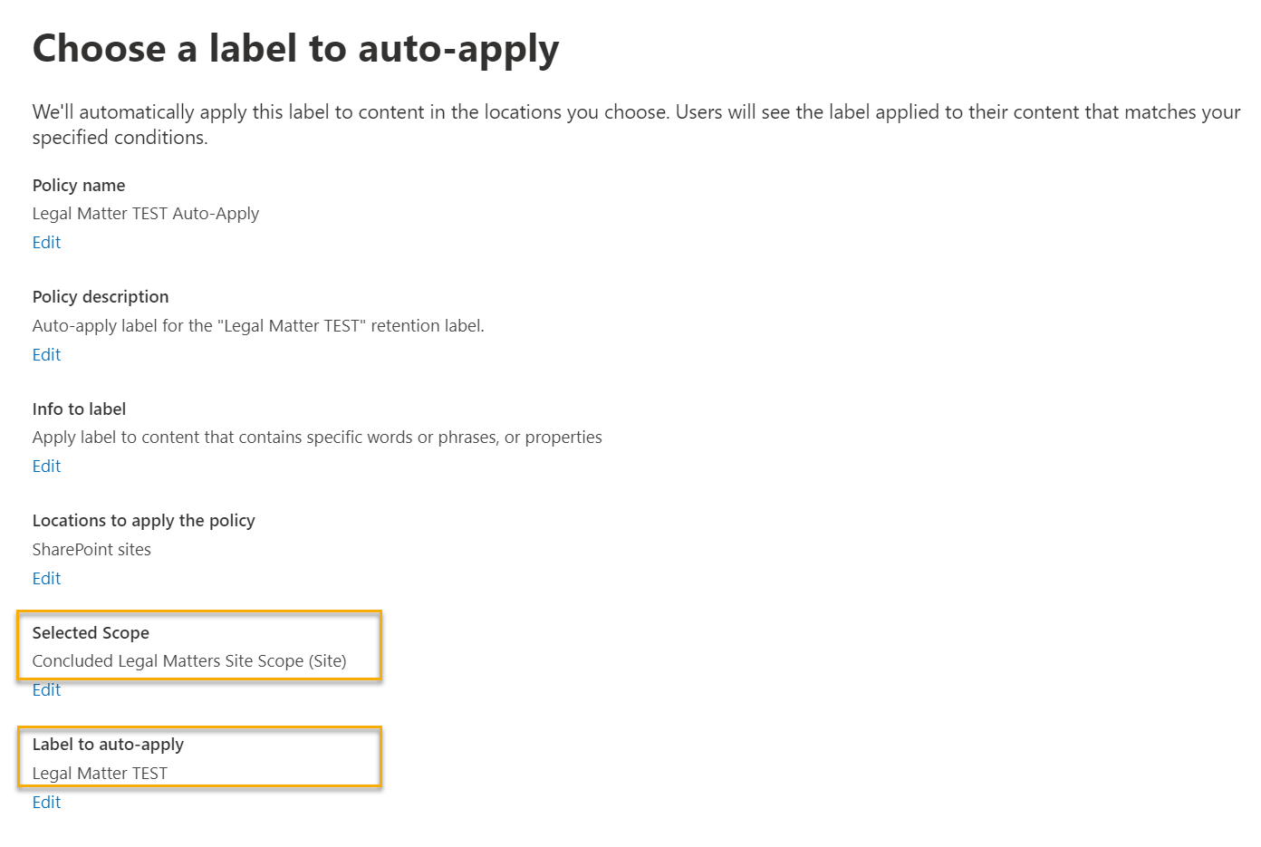 … and last, but not least, I select the retention label, Legal Matter TEST, to auto-apply for this label policy: