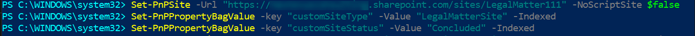 I used PnP PowerShell in my provisioning solution to set 2 properties on the Legal Matter site: (in addition to enabling scripts prior to setting the property bag values, you should also disable scripts when you’re done!)