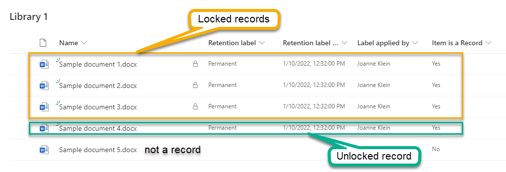 To verify the results we’re seeing, I seeded some records in 2 libraries across a site. As you can see, all documents with a record retention label have the Item is a Record column set to Yes; however once it is unlocked the only visual indication to you is the lock icon is removed from beside the document name. I’ve also intentionally applied different record retention labels, regular (non-record) retention labels, and have left some documents unlabeled: