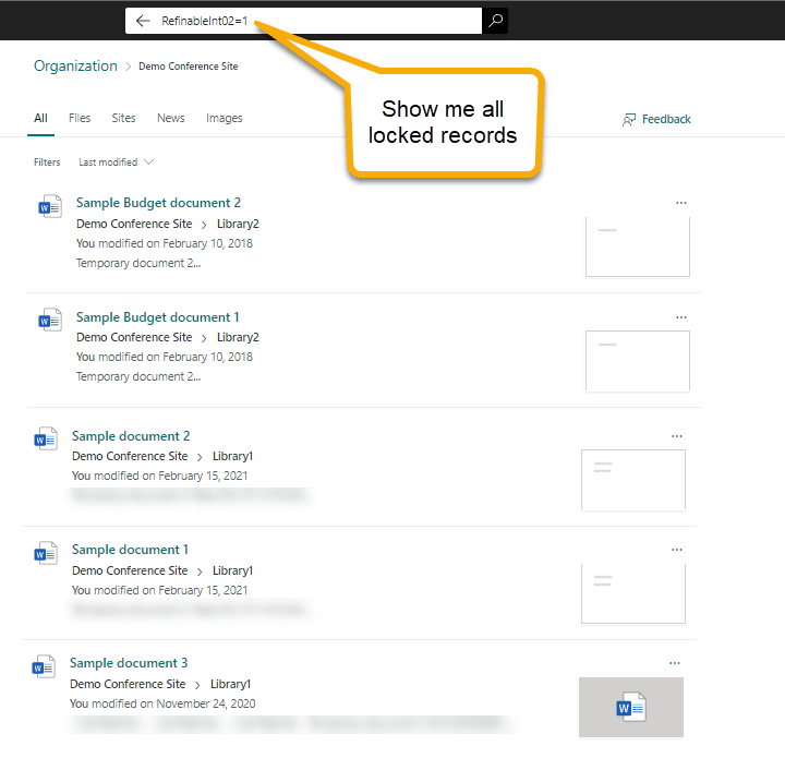 If you’re familiar with SharePoint search, the mapping for managed properties will be refreshed in the search index on the next full crawl of the item so you will need to re-index at least 1 site with records (both locked and unlocked) to allow you to test your queries. This will ensure the RefinableInt managed properties are updated in the search index.