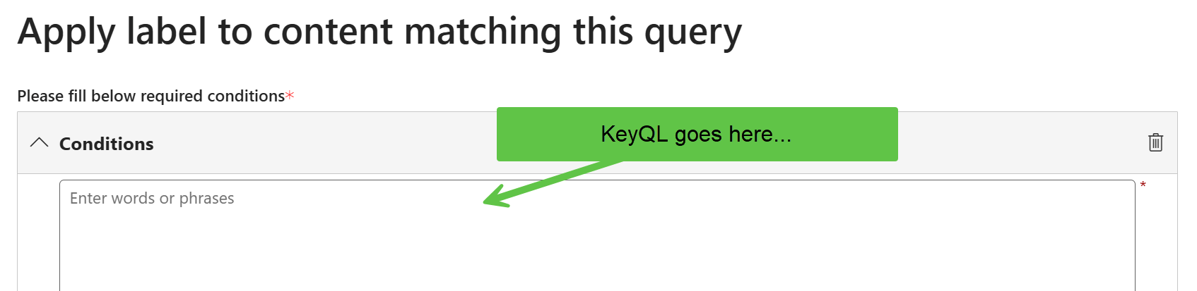 The next page shows where you enter your Keyword Query Language (KeyQL) query conditions to find matching content: